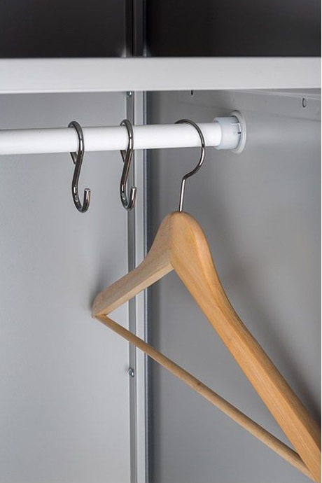 - Данная модель оборудована двумя полками, перекладиной для вешалок, крючками для одежды.