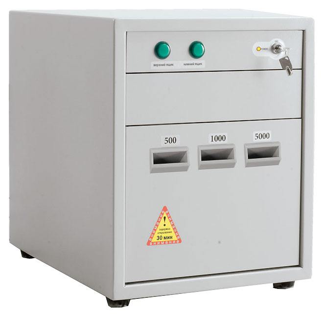 Нижний ящик снабжен 3-х секционной кассетой для хранения депонируемых банкнот раздельно по номиналам. Вместимость одной секции до 1500 купюр (в пачках)