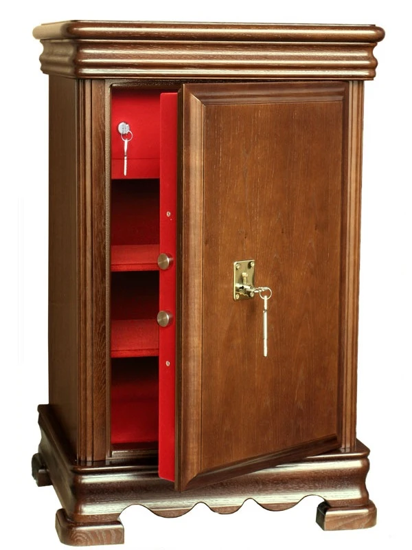 - снаружи сейф отделан натуральным деревом и дубовым шпоном, внутренняя отделка - красный бархат.<